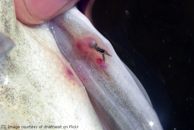 Lernaea parasite attached to fish fin 4 Sources of Koi Stress